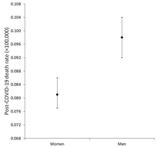 We identified a similar study that quantified the burden of post-COVID-19 mortality using the ICD-10 code U09.9 listed on death certificates [38]. The authors analyzed data from the Italian National Cause of Death Register and calculated the post-COVID-19 mortality rate for 2021 to be 5.1 × 100,000 inhabitants. Consistent with our findings, that study reported that the mortality rates increased with age and were higher in men compared to women (6.0 vs. 4.3 × 100,000, respectively).