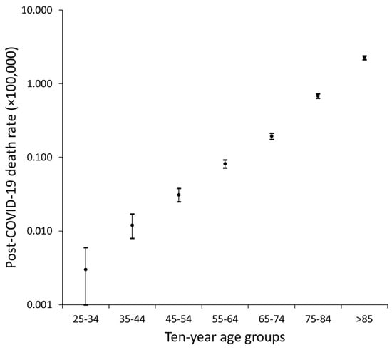 Crude mortality rates for post-COVID-19 condition across different 10-year age groups.