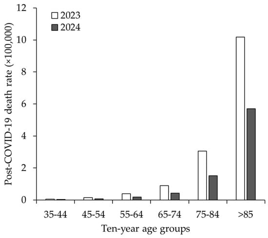 The crude mortality rates for the post-COVID-19 condition across the most representative 10-year age groups, stratified by year of death, are summarized in Figure 3. The data indicate that the age-related trend remained consistent between 2023 and 2024, as no death certificates containing the ICD-10 code U09.9 were recorded in the WONDER database. However, the mortality rates in 2023 were consistently higher than those in 2024 across all age groups.
