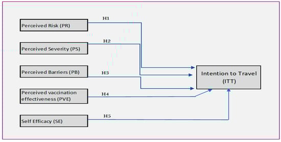 These studies (have improved our understanding of travel intentions by examining trust, solidarity, and electronic word of mouth [9,10]. They mainly focused on media exposure and destination image influencing travel intentions. However, they have not investigated the internal psychological processes that affect individual confidence and travel intentions during times of uncertainty. However, how the cognitive appraisals and self-regulatory beliefs influence intentions in post-crisis contexts is yet to be explored. Therefore, the present study framework addresses this gap by integrating core psychological constructs, i.e., perceived risk, perceived severity, perceived barriers, perceived vaccination effectiveness, and self-efficacy to intention to travel. The present study approach draws attention from health behavior theories, i.e., the Health Belief Model and Protection Motivation theory, to highlight how cognitive appraisals and self-regulatory beliefs influence travel intentions among the medical students of Malaysia. Medical professionals have a heightened awareness of health risks. They have seen the pandemic’s dangerous situation very closely and faced unique stressors during the pandemic. Therefore, mental health, burnout, and emotional well-being may influence their travel intentions. A study of this group could offer new insights into evidence-based decision-making coping mechanisms. It provides valuable insight into consumer behavior for the decision-making of a particular group in the aviation and tourism industries during the post-pandemic period. A data-driven approach to air travel demands prediction, and insights from the study can contribute to industry recovery during an epidemic.