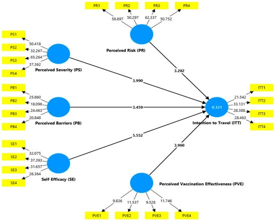 Figure 2 presents the structured model of the study, and Table 2 summarizes the structural model’s results. Table 2 shows that PR negatively affects the ITT (t = 3.195, p = 0.001), which is statistically significant. Similarly, perceived severity (H2) and perceived barriers (H3) have significant negative effects on the ITT in the post-pandemic period. On the other hand, Hypothesis 4 and Hypothesis 5 demonstrate that vaccination effectiveness and self-efficacy, respectively, have positive effects on the ITT.