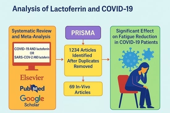 To further contribute to the existing body of research, the present study conducted a meta-analysis using the PRISMA methodology. From the database generated, specific articles were selected where the response variables would determine the inclusion criteria. In this case, the selected response variables focused on the effect of lactoferrin on a range of symptoms. This approach aims to systematically evaluate and synthesize evidence regarding the potential benefits of lactoferrin in the treatment of COVID-19. By leveraging rigorous data collection and analysis, this work seeks to provide a comprehensive perspective on the therapeutic possibilities of lactoferrin, contributing to the future understanding of its role in managing respiratory infections and its potential application in health emergencies.