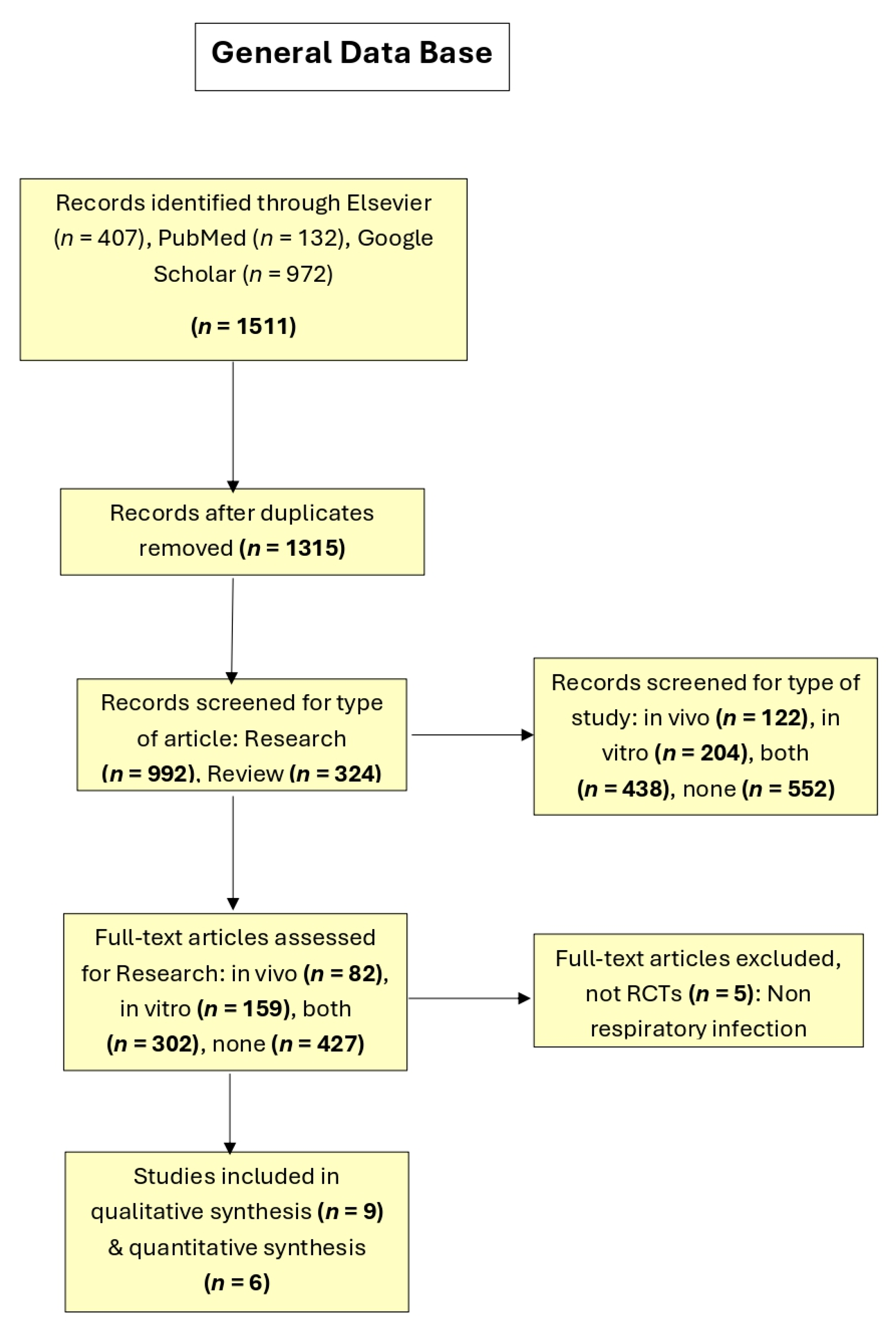Figure 4, which includes the filtered bases of the three search engines (i.e., Google Scholar, Elsevier, and PubMed), including the results of the applied filters: total articles excluding duplicates and subsequently the classification of research-type articles according to their type of study (in vivo, in vitro, both, or neither). Finally, with 82 research and in vivo study articles, a database was created, presented below.