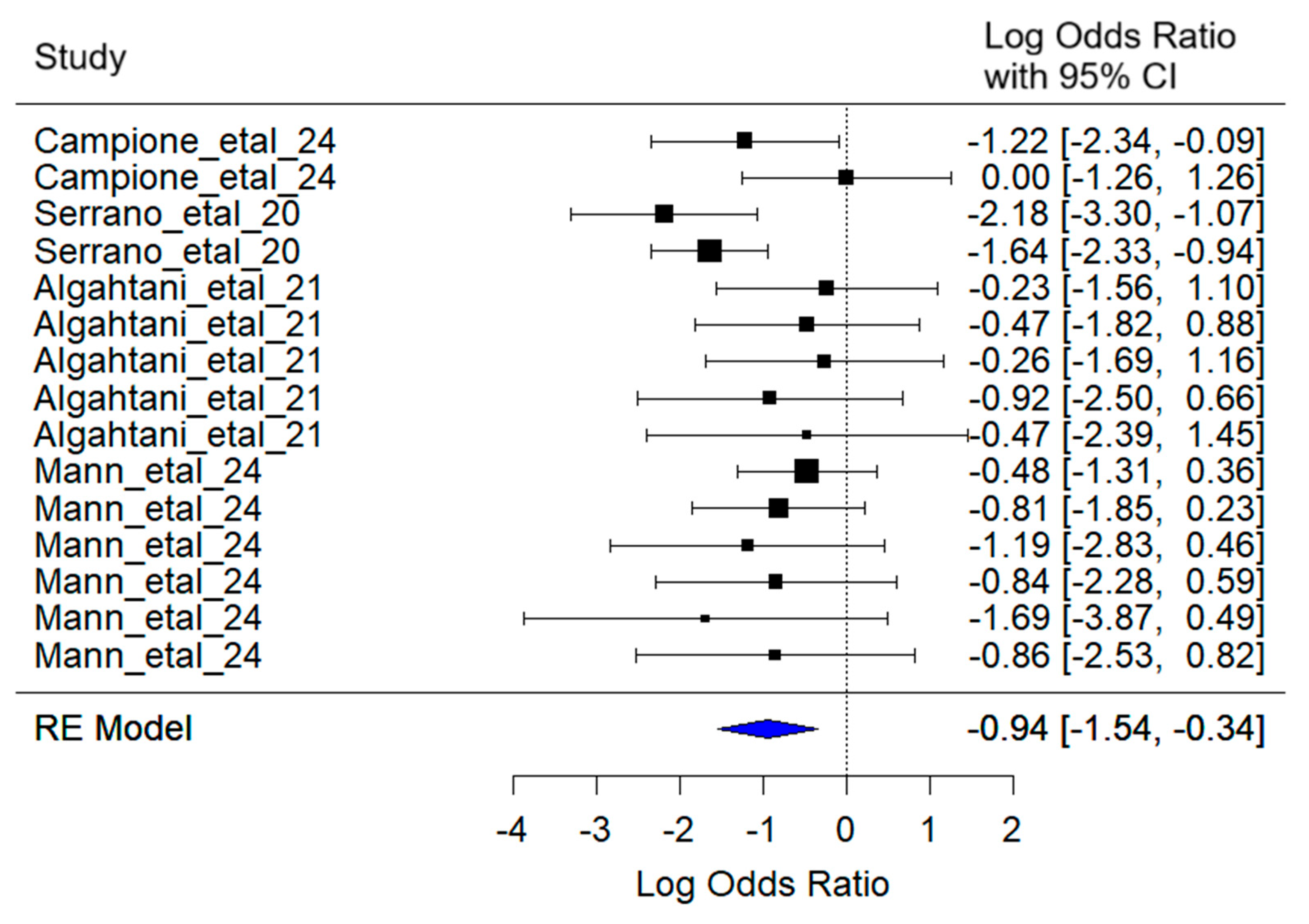 The combined effect estimate for the log (Odds Ratio) was −0.94 (95% CI: −1.54 to −0.34), indicating that lactoferrin administration significantly reduces the probability of fatigue in SARS-CoV-2 patients compared to controls (z = −3.05, p = 0.002). Patients treated with lactoferrin had approximately 61% lower odds of experiencing fatigue compared to those in the control group.