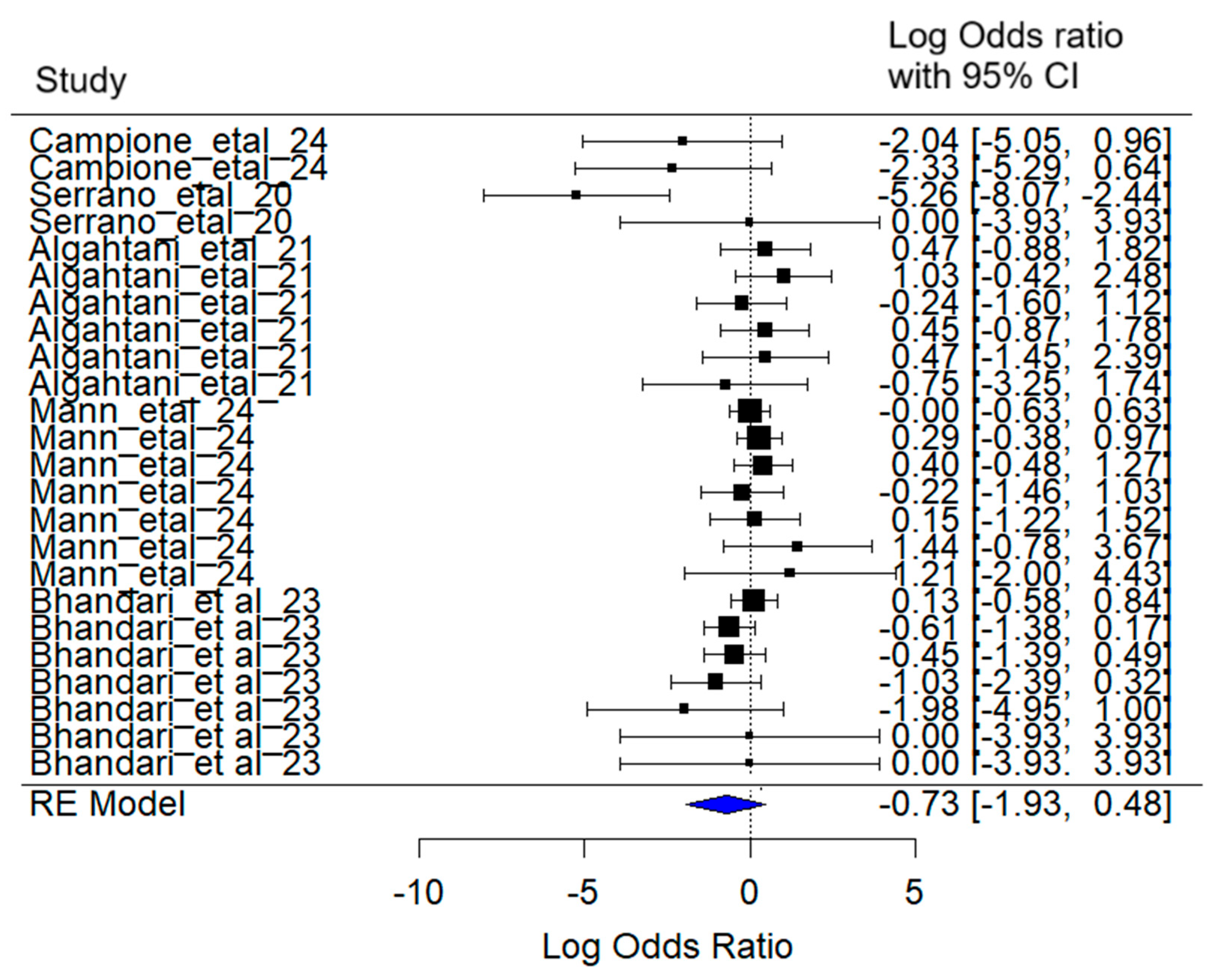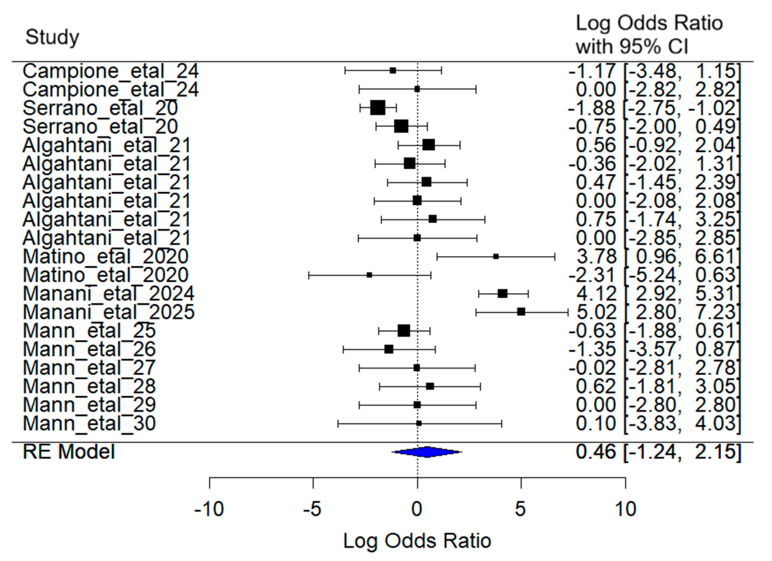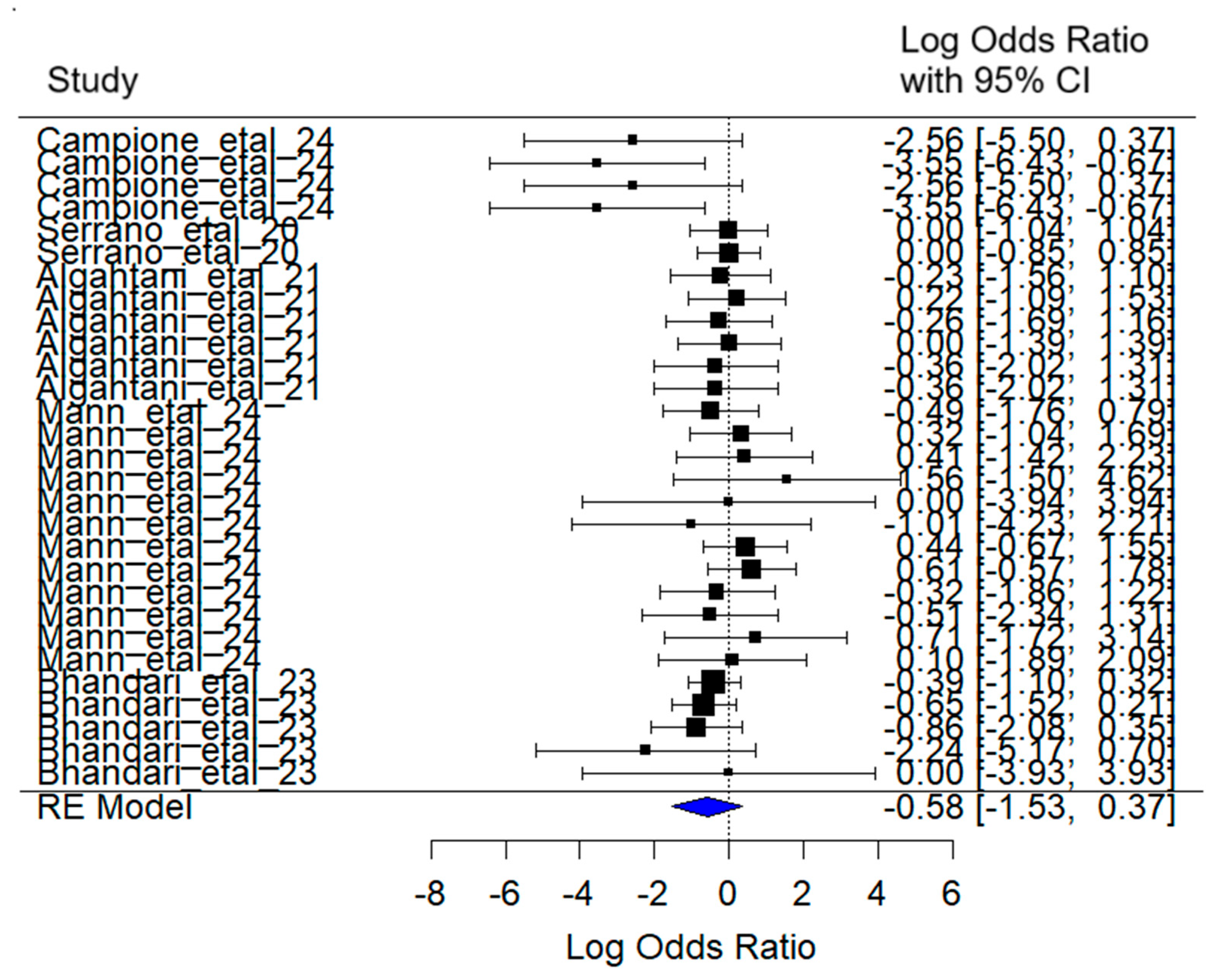 The combined effect estimate for the log (Odds Ratio) was −0.73 (95% CI: −1.93 to 0.47), suggesting a reduction in the probability of experiencing the headache symptom in SARS-CoV-2 patients treated with lactoferrin. However, this reduction was not statistically significant (z = −1.18, p = 0.24).
