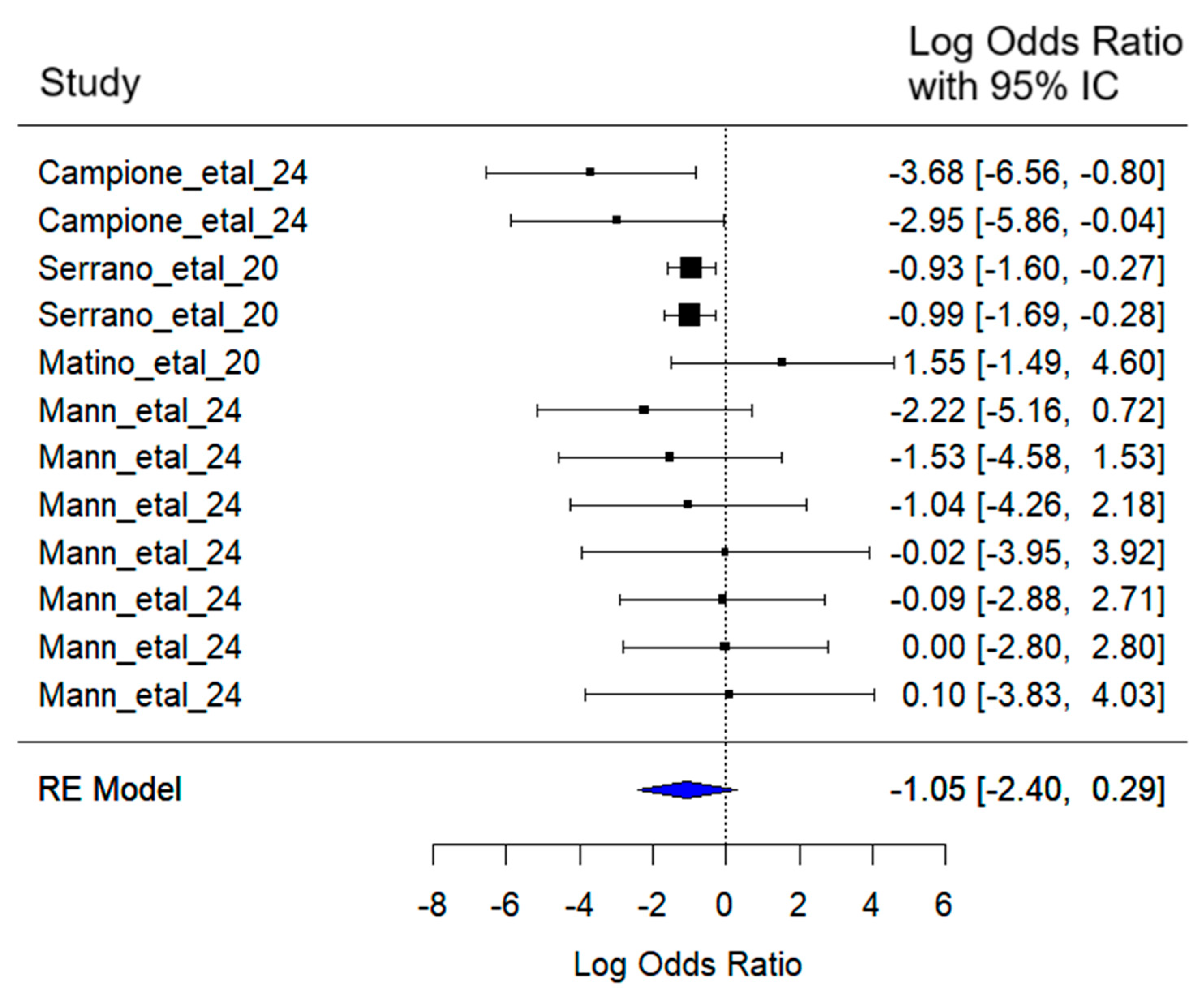 The combined effect estimate for the log (Odds Ratio) was –0.58 (95% CI: −1.52 to 0.37), suggesting a reduction in the probability of experiencing the anosmia/ageusia symptom in SARS-CoV-2 patients treated with lactoferrin. However, this reduction was not statistically significant (z = −1.20, p = 0.23).