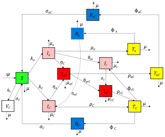 The model is structured into thirteen human compartments: The subpopulations of the human population at time denoted by . The sub-populations of the human population at time denoted by include susceptible individuals COVID-19-infected individuals acute hepatitis-B-infected individuals , acute hepatitis-B-infected and COVID-19-infected individuals chronic hepatitis-B-infected individuals chronic hepatitis-B- and COVID-19-infected individuals acute hepatitis-B-infected individuals receiving treatment COVID-19-infected individuals receiving treatment acute hepatitis-B and COVID-19 co-infected individuals receiving treatment acute hepatitis-B-recovered individuals COVID-19-recovered infected individuals , acute hepatitis-B- and COVID-19-recovered individuals , and COVID-19-vaccinated individuals
