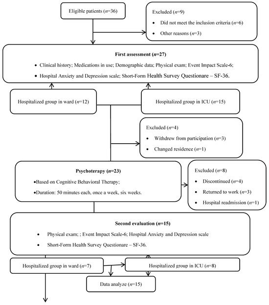 The recruitment process is illustrated in Figure 1. Initially, 36 patients were assessed for eligibility. Of these, nine were excluded from the study. The remaining 27 patients began the initial assessment, but four were lost before the start of psychotherapy (three due to withdrawal from participation and one due to a change of residence). Of the 23 patients who began the intervention, eight discontinued over the six-week study period (four due to discharge, three due to return to work, and one due to hospital readmission). Therefore, the final analysis included the 15 patients who completed the intervention protocol.