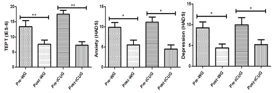 Effects of psychotherapeutic intervention on PTSD, anxiety, and depression scores. Bar graphs show mean scores (± standard error) for the ward group (WG) and the ICU group (ICUG) before (Pre) and after (Post) the six-week intervention. Asterisks indicate statistically significant differences (* p < 0.05; ** p < 0.01) in within-group comparisons.