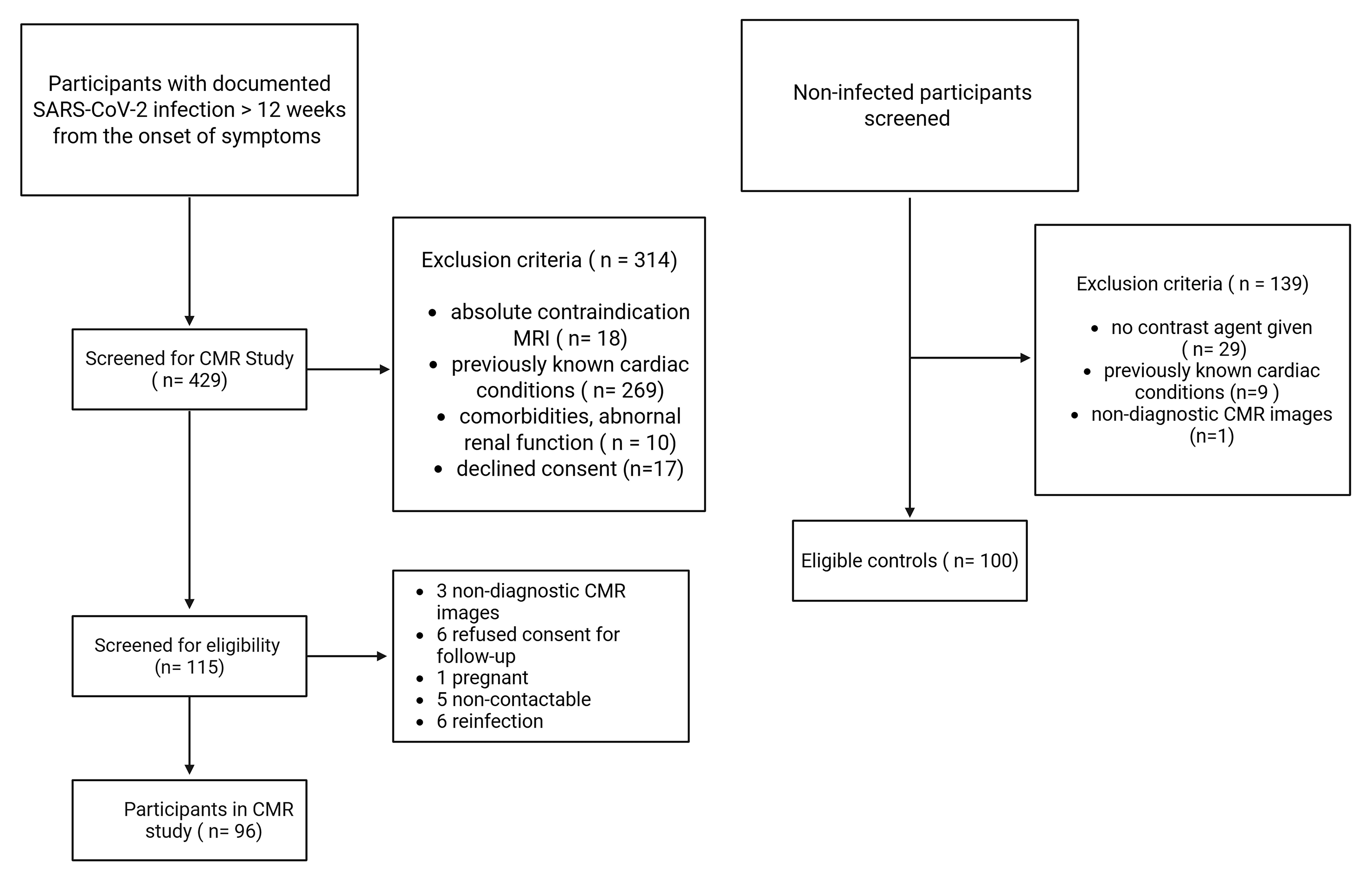 - Persistent cardiac symptoms (e.g., chest pain, dyspnea, palpitations, or exercise intolerance) for at least three months after COVID-19 diagnosis, with negative RT-PCR at the time of CMR assessment;