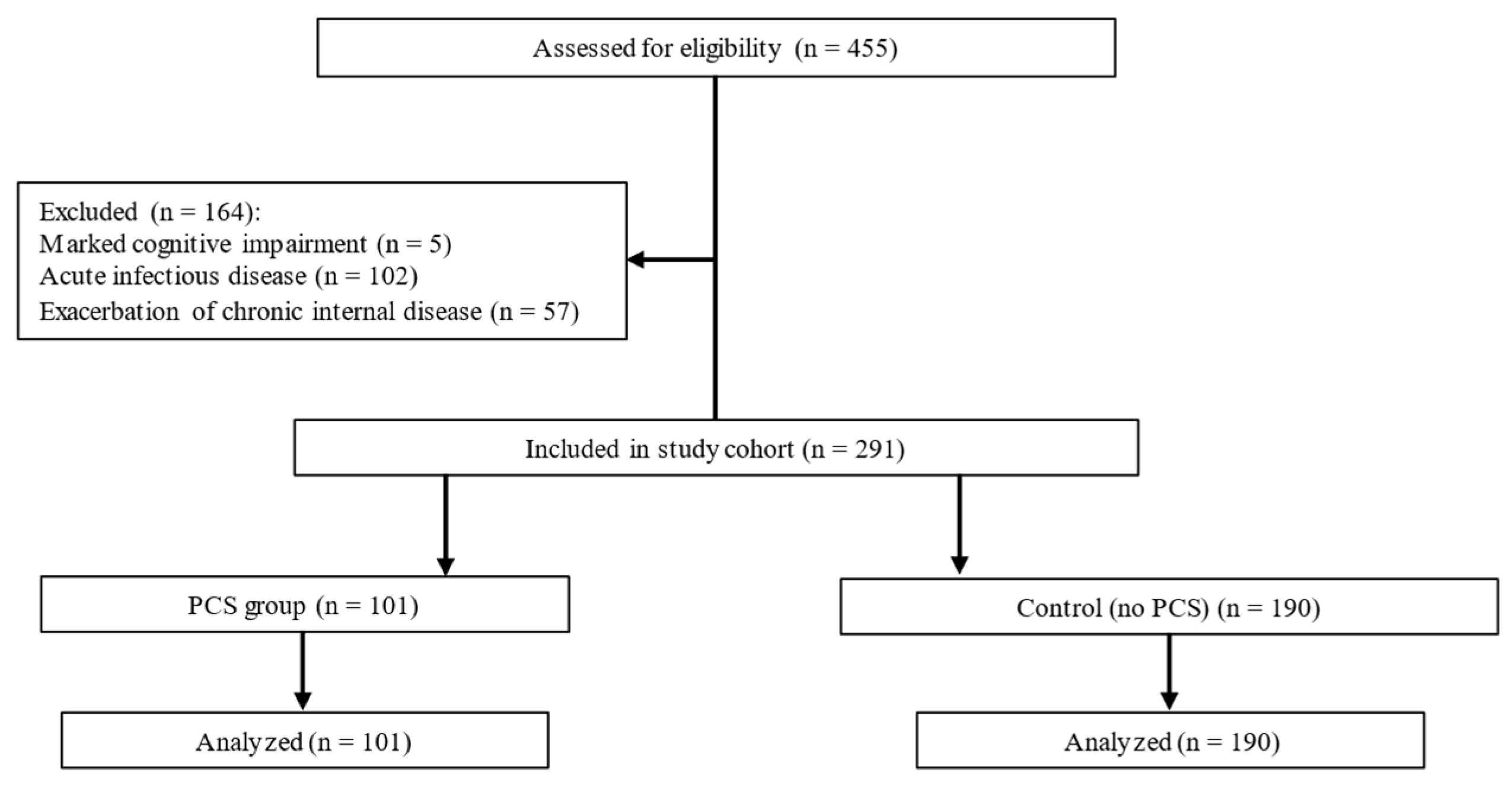 A total of 291 patients with AH met the inclusion/exclusion criteria and were enrolled. Based on the presence of PCS, participants were divided into two groups: PCS (n = 101) and control without PCS (n = 190) (Figure 1).