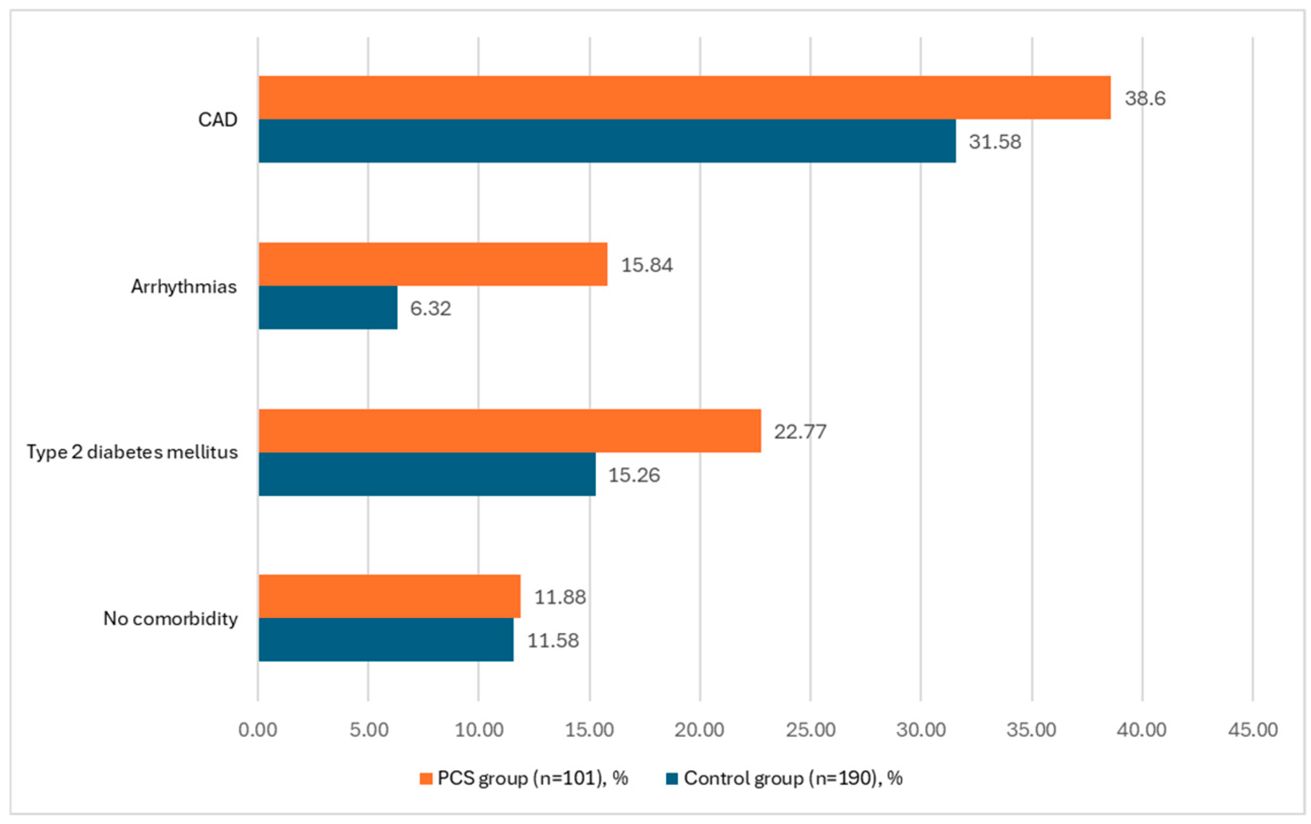 In unadjusted between-group comparisons (Figure 2), only rhythm disturbances differed significantly, being more frequent in the PCS group (15.84% (n = 16) vs. 6.32% (n = 12); OR = 2.79, 95% CI 1.27–6.16; p = 0.012). Differences in ischemic heart disease (38.61% (n = 39) vs. 31.58% (n = 60); OR = 1.36, 95% CI 0.82–2.26; p = 0.244) and type 2 diabetes mellitus (22.77% (n = 23) vs. 15.26% (n = 29); OR = 1.64, 95% CI 0.89–3.01; p = 0.147) did not reach statistical significance. The proportion without comorbidities was virtually identical (11.88% (n = 12) vs. 11.58% (n = 22); OR = 1.03, 95% CI 0.49–2.18; p = 0.999).