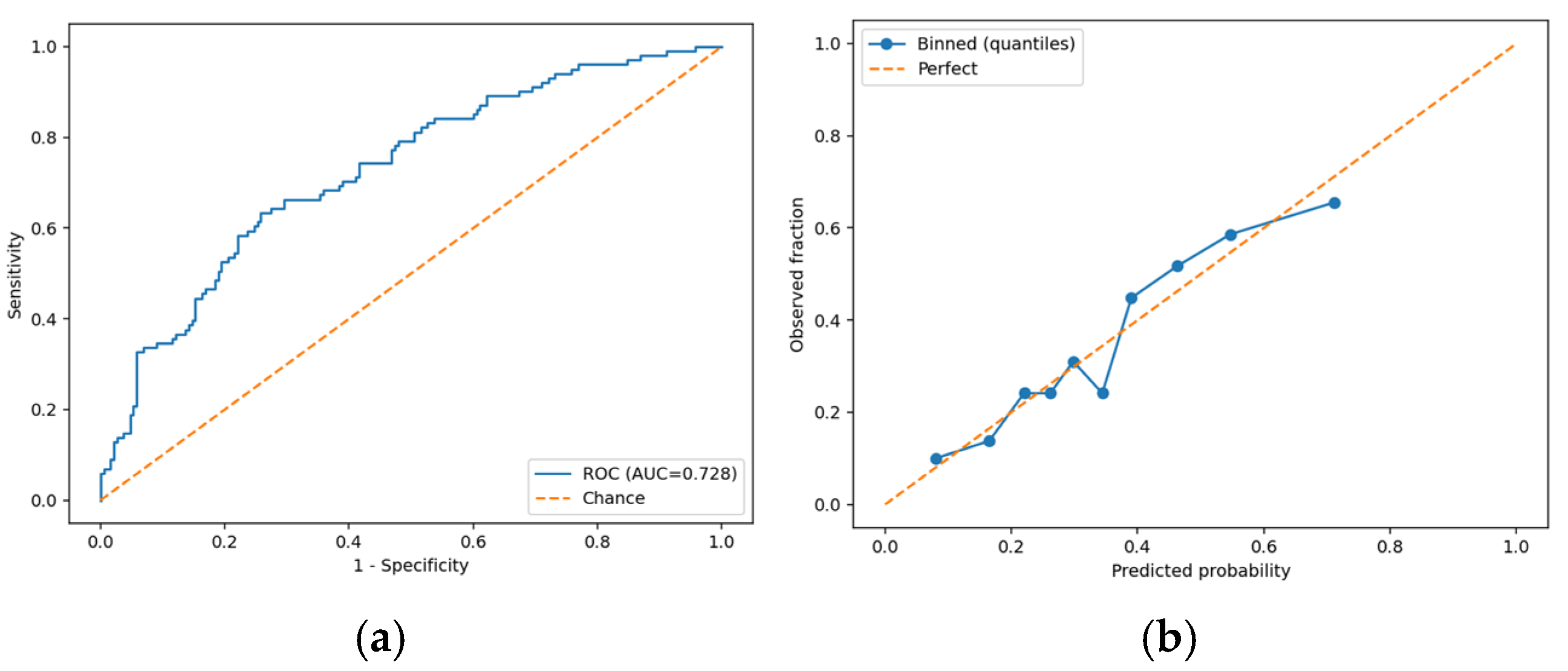 The overall contribution of the model was statistically significant: Omnibus LR χ2 = 44.731 (df = 10), p = 2.43 × 10−6. Fit indices were −2LL = 331.020; Cox–Snell, R2 = 0.142; and Nagelkerke, R2 = 0.197. Discriminative ability was rated as moderate: AUC = 0.728 (bootstrap 95% CI 0.668–0.787) (Figure 3a). Overall prediction error by the Brier score was 0.193 (bootstrap 95% CI 0.172–0.215). Calibration was deemed satisfactory: Hosmer–Lemeshow, χ2 = 3.216, df = 8, and p = 0.920; the calibration intercept was −0.000 (SE 0.164), and the calibration slope was 1.000 (SE 0.172), both close to the ideal values (Figure 3b). Internal validation with optimism correction (bootstrap, B = 200) yielded an optimism-corrected AUC of 0.686 (apparent 0.728) and an optimism-corrected calibration slope of 0.736 (apparent 1.000). The events-per-variable ratio was 10.1 (101 events, 10 predictors).