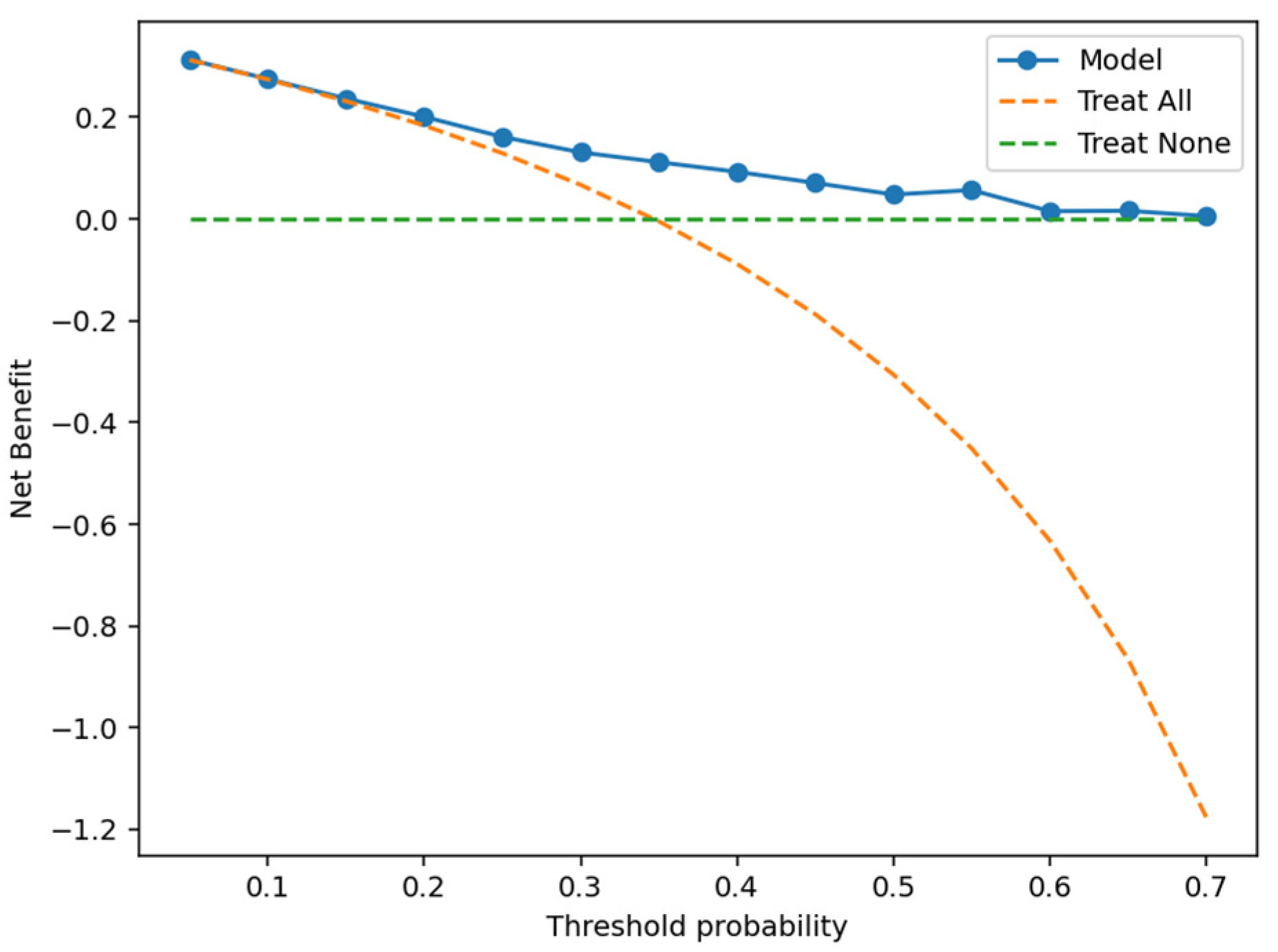 According to the ROC analysis, the optimal probability threshold by Youden’s index was 0.372; at this cut-off, sensitivity was 63.4%, specificity 74.2%, and overall accuracy 70.4% (TP = 64, TN = 141, FP = 49, and FN = 37). At a threshold of 0.35, sensitivity and specificity were 66.3% and 66.3%, respectively (accuracy 66.3%; PPV 51.1%; NPV 78.8%). At the conventional 0.50 threshold, sensitivity and specificity were 36.6% and 87.9%, respectively (accuracy 70.1%; PPV 61.7%; NPV 72.3%). Decision-curve analysis (DCA) showed a positive net clinical benefit, with the model outperforming a “treat-all” strategy across threshold probabilities of approximately 0.10–0.65 and never inferior to a “treat-none” strategy over the examined range (Figure 4).