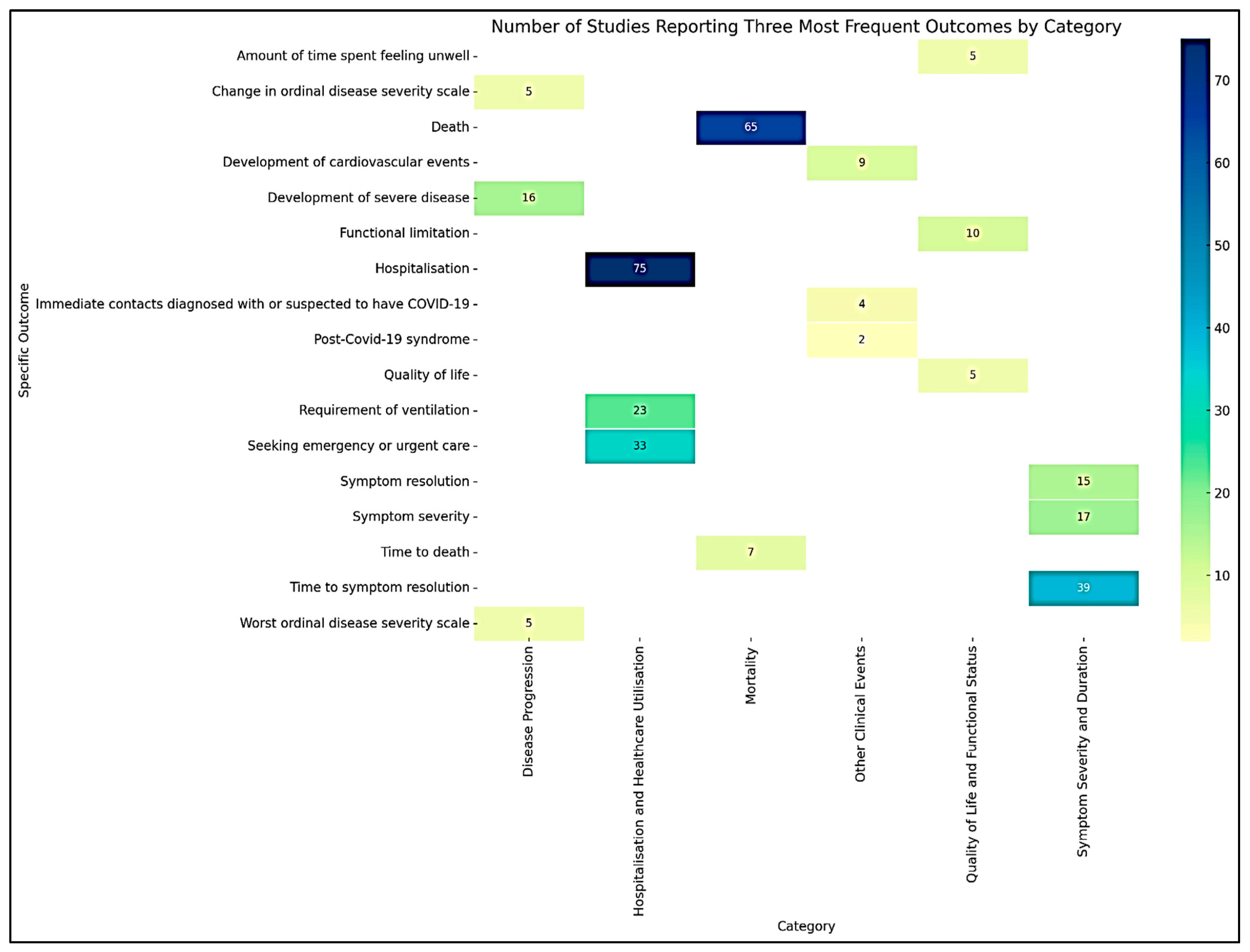 | Outcome Category | No. of Studies (%) | Top Three Reported Outcomes |