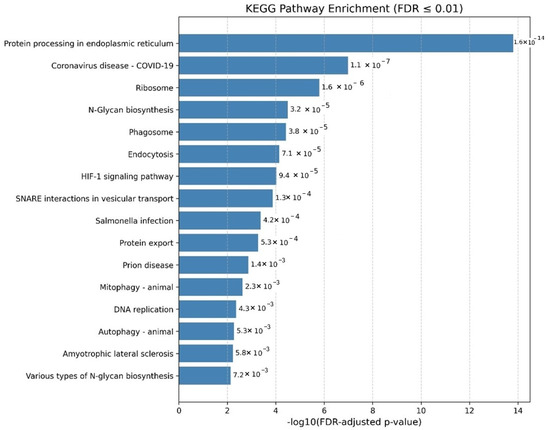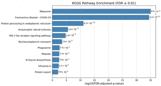 KEGG pathway enrichment analysis of human proteins interacting with the SARS-CoV-2 Delta variant. Enriched pathways include protein processing in the endoplasmic reticulum, ribosome, and coronavirus disease pathways, indicating disruptions in host protein folding, translation, and immune signaling associated with increased transmissibility and disease severity.