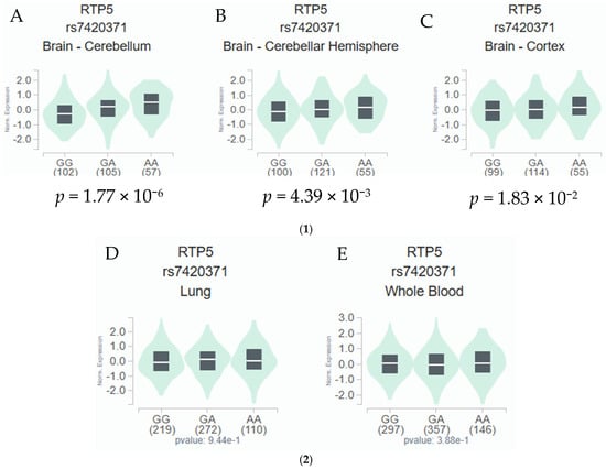 (1) eQTL Analysis of rs7420371 G>A and mRNA Expression Levels of RTP5 in the Cerebellum, Cerebellar Hemisphere, and the Cerebral Cortex. The rs7420371 A allele is significantly associated with an increased expression of RTP5 in 266 brain cerebellum tissues from the GTEx database (A). The rs7420371 A allele is significantly associated with an increased expression of RTP5 in 277 brain cerebellar hemisphere tissues from the GTEx database (B). The rs7420371 A allele is significantly associated with an increased expression of RTP5 in 270 cerebral cortex tissues from the GTEx database (C). Abbreviations: eQTL, expression quantitative trait loci; mRNA, messenger RNA; RTP5, receptor/chemosensory transporter protein 5. (2) eQTL Analysis of rs7420371 G>A and mRNA Expression Levels of RTP5 in the Lung and Whole Blood. The rs7420371 A allele is not statistically significantly associated with an increased expression of RTP5 in 604 lung tissues from the GTEx database (D). The rs7420371 A allele is not statistically significantly associated with an increased expression of RTP5 in 803 whole blood tissues from the GTEx database (E). Abbreviations: eQTL, expression quantitative trait loci; mRNA, messenger RNA; RTP5, receptor/chemosensory transporter protein 5.