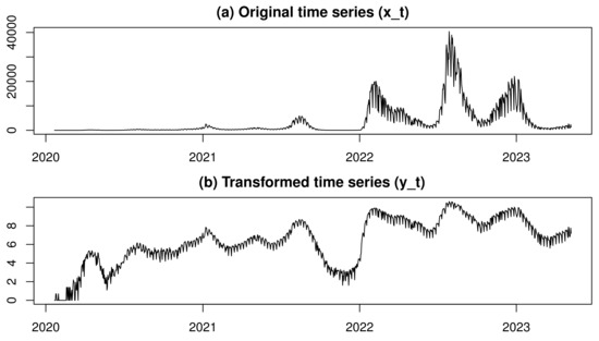 The data used in this analysis were obtained from the Ministry of Health, Labour and Welfare (MHLW) website of Japan (see https://www.mhlw.go.jp/stf/english/index.html, accessed on 31 December 2024). The analysis covers all prefectures of Japan. The daily changes in new COVID-19 cases for each prefecture span from 20 January 2020 to 7 May 2023, covering a total of 1204 days, equivalent to 172 weeks. The original time series is denoted as , and for the analysis, we transform it into . The purpose of applying the logarithmic transformation was to make the amplitude of the cyclical fluctuations in the time series approximately uniform. However, since the original time series contains zeros, we added 1 before applying the logarithmic transformation. Therefore, the minimum value of the transformed time series is 0.