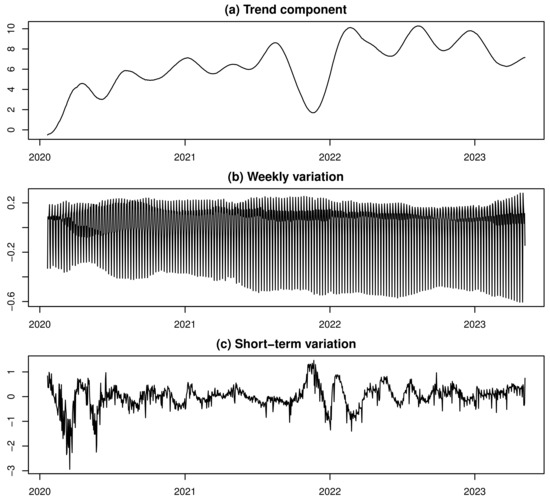 Decomposition results of the transformed time series for Tokyo: (a) trend component, (b) weekly fluctuation component, and (c) short-term component.