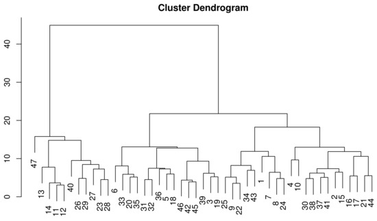 Using the estimated relative lags mentioned above, a cluster analysis of the prefectures was performed using the method introduced in Section 3.2. Note that the Ward method in the free software R was used for the cluster analysis. The resulting dendrogram is shown in Figure 4. The dendrogram resembles an inverted tree. From this figure, hierarchical similarities in the fluctuation patterns in the trend components between prefectures can be observed. The numbers at the bottom of the leaves represent the prefecture numbers, and as you move upward, the branches bind hierarchically. Prefectures (or groups of prefectures, called clusters) that bind earlier have a higher degree of similarity. Additionally, the height of the branches represents the distance between prefectures (or clusters).