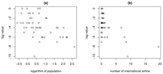 For reference, the correlation between the logarithm of the population and the estimated lag value , as well as between the number of international airlines and , was calculated. The results were and , respectively, indicating a weak negative correlation in both cases. Figure 5a,b show scatter plots of the logarithm of the population and the number of international airlines, respectively, against the estimated lag value.