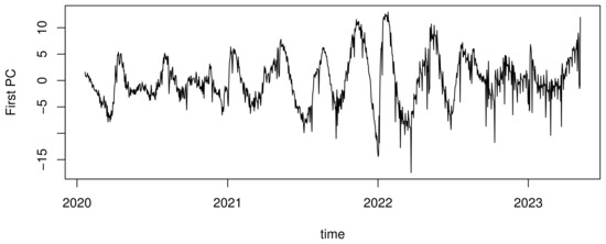 In this section, we analyze the effects of holidays and seasons included in the short-term component using a regression analysis. First, the principal component analysis (PCA) was performed based on the correlation matrix of the short-term components for all combinations of prefectures. The contribution ratio of the first principal component (PC) was 42.78%, and its time series, , is shown in Figure 6. This figure clearly shows periodic fluctuations in the time series of the principal component .