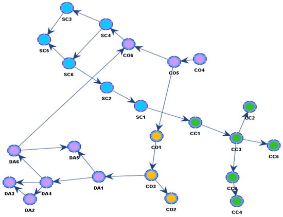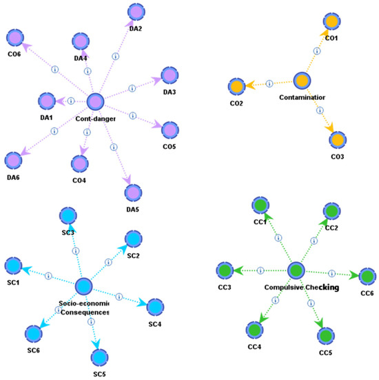 Next step was clustering variables into groups, which is similar to creating a latent variable in conventional SEM. The network visualizes the grouping of items within their respective constructs, highlighting distinct clusters represented by nodes of the same color. Variables sharing the same color exhibit strong interconnections, suggesting a high level of internal consistency and, thus, they are in the same group. As a result, a total of five groups were developed (see Figure 1). Five groups include contamination group (i.e., CO1, CO2, and CO3), compulsive checking group (i.e., CC1, CC2, CC3, CC4, CC5, and CC6), socio-economic consequences group (i.e., SC1, SC2, SC3, SC4, SC5, and SC6), and danger–contamination mixed group (i.e., DA1, DA3, DA3, DA4, DA5, DA6, CO4, CO5, and CO6). In other words, the nodes in Figure 1 that are colored the same can be considered as belonging to the same group, and these nodes form new factor-nodes, which are similar to latent variables and observed variables in SEM, in the next stage of multiple clustering. Taylor et al. [13] suggested all items in contamination should be in a same group, but machine learning-based Bayesian PSEM in this research claimed that the some of the items in contamination construct are included in the construct of danger. In other words, the nodes belonging to danger and some nodes from contamination form a new group, while the remaining nodes from contamination create a separate group.