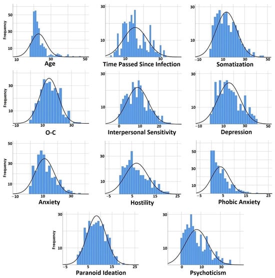 Furthermore, partial Kendall’s Tau correlations indicated that as the TSI increased, the scores for O-C symptoms, interpersonal sensitivity, depression, anxiety, hostility, and paranoid ideation also exhibited an upward trend. A separate analysis of these associations by sex revealed that with increasing TSI, men’s scores in hostility rose, while women’s scores in interpersonal sensitivity, depression, and anxiety increased. These findings align with the existing literature suggesting that mental health deterioration along the trajectory of time elapsed since COVID-19 infection is observed in patients with a history of COVID-19 infection [,,]. Furthermore, the current study demonstrates that these associations are more prevalent in women than in men. This finding is consistent with previous research [].