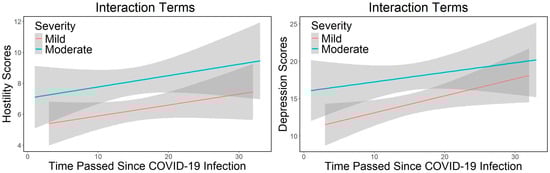 Further examination of the statistical models revealed that the interaction between the duration of time since infection and the severity of the disease was statistically significant for depression (F(26) = 2.158, p = 0.002, partial η2 = 0.215) and hostility (F(26) = 1.578, p = 0.043, partial η2 = 0.167). The interaction plots for the examined variables indicated that the interaction effect was more pronounced and obvious for depression than for hostility (Figure 2). The depression scores were consistently lower in mild cases compared to moderate cases; however, there was a notable increase in depression scores over time since infection, particularly from month 10 onwards. This increase was steeper in mild cases when compared to moderate cases. In contrast, hostility scores displayed a relatively stable gradient of increase over time, with the interaction effect being prominently less obvious.