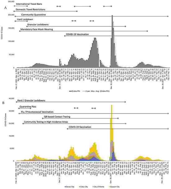 (A). Epi curves and timeline of major public health interventions against COVID-19 implemented in the entire Philippines; (B). Epi curves and timeline of major public health interventions against COVID-19 implemented in representative HUCs (Quezon City, City of Manila, Cebu City, and Davao City).