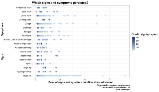 Cough and shortness of breath were the most predominant symptoms documented on admission, 1447 (28.8%) and 1380 (27.4%), respectively (Supplementary Table S1). Some signs and symptoms persisted in a majority of patients during the follow-up days, with hypoxia, chest pain, and cough being among the enduring manifestations. Furthermore, a proportion of patients still required adjustments in their treatment regimen more than two months after the first day of admission (Figure 1 and Figure 2).