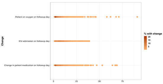 Change in patient clinical condition and management on follow-up day: oxygen requirement, ICU admission status, and medication change on follow-up date.