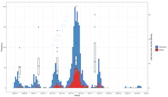 Trends in admissions, mortality, and mortality rates of hospitalized COVID-19 patients between July 2020 and November 2022. The x-axis represents the time period, with specific waves of the pandemic illustrated. The y1-axis (left) represents the number of admissions and deaths, while the y2-axis (right) represents the mortality rates per wave, illustrated by the box plots.