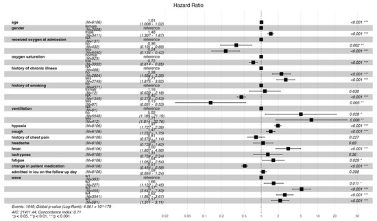 An increase in age, male gender, no history, and a positive history of chronic illness were associated with statistically significant risk of mortality (HR: 1.01 [CI: 1.008–1.02], 1.48 [CI: 1.31–1.67], 2.28 [CI: 1.58–3.28], 2.71 [CI: 1.88–3.92], respectively). Patients who presented with persistent hypoxia, cough, fever, and fatigue had a significant increased risk of death (HR: 1.97 [CI: 1.73–2.26], 1.47 [CI: 1.24–1.75], 3.00 [CI: 1.81–4.98], 1.64 [CI: 1.05–2.54], respectively). Additionally, admission during waves two, three, four, and five was significantly associated with increased risk of mortality compared to wave one (HR: 1.66 [CI: 1.22–2.45], 5.17 [CI: 3.55–7.53], 2.62 [CI: 1.87–3.67], 2.17 [CI: 1.51–3.11], respectively). Patients who presented with low oxygen saturation at admission and received oxygen had a reduced risk in mortality (HR: 0.72 [0.61–0.85], 0.24 [0.13–0.42], respectively). A change in medication was associated with a 49% reduction in the risk of death (HR: 0.51 [CI: 0.45–0.58]) (Figure 4 below).