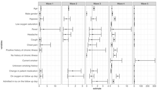 Forest plots illustrating both time- and non-time-varying predictors of mortality and the risk of mortality across each of the five different waves.