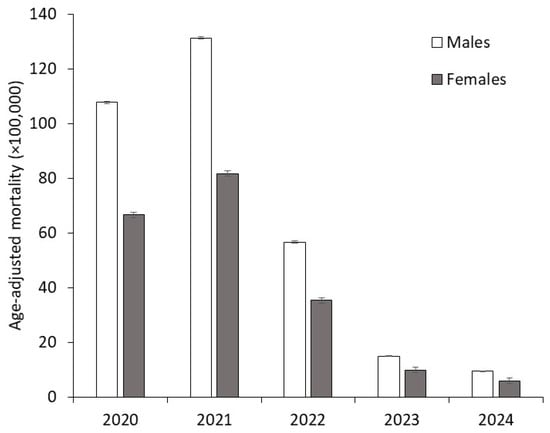 Age-adjusted mortality rates for coronavirus disease 2019 (COVID-19) stratified by gender across the first five years of the pandemic (2020–2024).