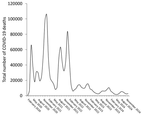 The dynamics of COVID-19-related mortality during the first five years of the pandemic reflect the evolving nature of the crisis, with a considerable decline observed over time. This reduction can be attributed to multiple interrelated factors, including the widespread availability of COVID-19 vaccines and the development of natural immunity against the virus [11,12]; advances in clinical management that have improved and refined the therapeutic arsenal against this life-threatening disease [13]; and the high mortality among older and more vulnerable populations during the early pandemic years (2020–2021) which may have further reduced the pool of individuals at the highest risk of a worse clinical outcome and contributed to fewer deaths in subsequent years, along with the emergence of less virulent variants that has led to the gradual attenuation of SARS-CoV-2 virulence [14].