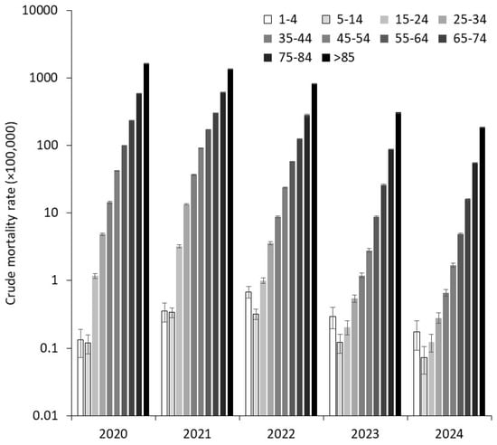 Crude mortality rates for coronavirus disease 2019 (COVID-19) stratified by age classes across the first five years of the pandemic (2020–2024).