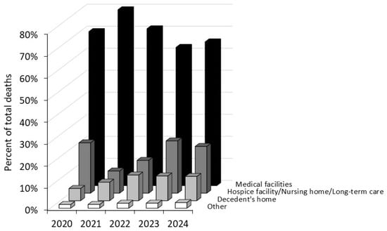Cumulatively, the percentage of deaths occurring in medical facilities clearly decreased over time, while the proportion of deaths in residents’ homes nearly doubled between 2020 and 2024.