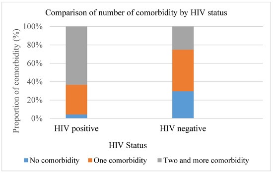 As shown in Figure 2 below, the prevalence of comorbidity among COVID-19 patients with HIV infection was 151 (95.6%) and 349 (70.4%) among the HIV-negative patients, while among patients with two or more comorbidities, 100 (63.3%) were HIV positive and 125 (25.2%) were HIV negative.