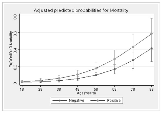 Generally, Figure 3 above shows that the probability of mortality increased with increasing age, more so for the individuals with positive HIV status compared to those with negative HIV status. And the difference in COVID-19 mortality probability was statistically significant (p = 0.007).