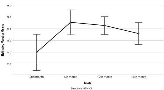 The changes in dimensions of SF-36 scale are presented in Table 2. Physical functionality increased at the 6th month compared to the 2nd month (p < 0.001). It then remained at similar levels in the third measurement (12th month; p > 0.999) and the final measurement (18th month; p = 0.957 compared to 12 months). Physical functionality was significantly better in the last measurement compared to the second month (p < 0.001). The score in the physical role dimension showed a significant increase at the 6th month compared to the second month (p < 0.001) and in the final measurement (18th month), compared to the 12th month (p = 0.004). The physical role was also significantly better in the last measurement compared to the first (p < 0.001). Similarly, physical pain showed a significant improvement at the 12th month compared to the 6th month (p = 0.012). Pain in the last measurement was significantly better than in the first (p = 0.002). General health also showed a significant improvement at the 12th month compared to the 6th month (p = 0.014) and was better in the final measurement compared to the first (p = 0.009). Vitality increased significantly at the 6th month compared to the 2nd month (p = 0.028) and then decreased at the 18th month (p = 0.035), remaining at levels similar to the initial ones (p > 0.999 between last and first measurement). Both the social and emotional roles improved at the 6th month compared to the 2nd month (p < 0.001, p = 0.001 respectively) and then remained at similar levels, which, in the last measurement, were significantly better than in the first (p < 0.001 for both dimensions). The dimension and the summary scale of mental health showed improvement at the 6th month compared to the second month (p = 0.007, p = 0.025 respectively) and remained at similar levels at the 12th and 18th month. The scores in the last measurement were significantly higher than in the 2nd month, but no statistically significant difference emerged (p = 0.086, p = 0.299 respectively). In contrast, physical health, which also improved at the 6th month compared to the 2nd month (p < 0.001), remained at similar levels afterward, was significantly better in the final measurement compared to the initial one (p < 0.001). The changes in PCS and MCS are given in Figure 1 and Figure 2, respectively.