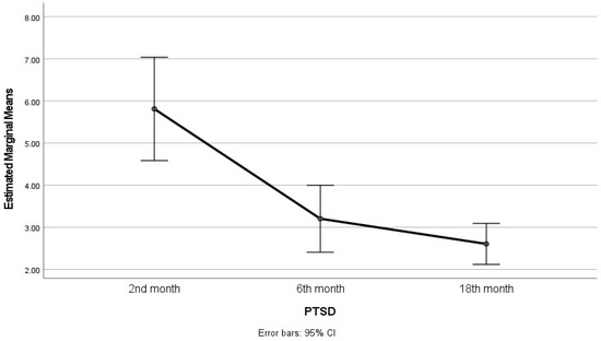 Post-traumatic stress was assessed at the 2nd, 6th and 18th months (Figure 3). Its reduction was significant at the 6th month compared to the 2nd month (p < 0.001). In the final assessment, it had decreased further compared to the 6th month, although no statistically significant change was observed (p > 0.999). A significant reduction was noted in the final measurement compared to the first at the second month (p < 0.001). Changes on PTSD score are given in Table 3.