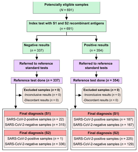 Sample size was calculated using the Buderer’s formula [9], ensuring statistical robustness with at least 173 positive and 62 negative samples (considering an expected sensitivity of 90%, expected specificity of 85%, 95% confidence interval (95% CI), with precision within 10%, and an expected disease prevalence of 20%). In order to ensure robustness of the results, a total of 691 serum samples were analyzed. Of these, 354 were obtained from 128 individuals hospitalized with COVID-19 between March and October 2020 in Salvador, Brazil, and the surrounding areas (Aliança and Aeroporto hospitals). Peripheral blood (9 mL) was collected using clot-activator tubes with gel separators (Vacuplast, Brazil) in collaboration with hospital clinical teams. After a 30 min clotting period at room temperature, samples were centrifuged at 3000× g for 10 min. Serum was aliquoted into cryotubes, transported to the Gonçalo Moniz Institute (Fiocruz-BA), and stored at −20 °C until analysis. These samples were stratified by days post-symptom onset (PSO): 0–7 days (n = 147), 8–14 days (n = 133), 15–21 days (n = 31), and >22 days (n = 43).