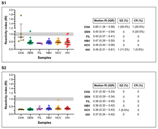Cross-reactivity analysis of (S1) or (S2) recombinant SARS-CoV-2 antigens against sera from individuals with unrelated infections. Conditions included Chagas disease (CHA; n = 5), dengue (DEN; n = 20), filariasis (FIL; n = 5), hepatitis B (HBV; n = 20), hepatitis C (HCV; n = 20), and HIV (n = 18). The cut-off was set at RI = 1.0, with a gray zone defined as RI = 1.0 ± 0.10. Lines represent medians and interquartile ranges. Abbreviations: GZ (gray zone), RI (reactivity index), CR (cross-reactivity).