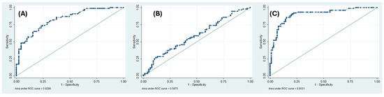 Neutrophil/leukocyte ratio predicting (A) Intensive Care Unit (B) Mechanical ventilation (C) In-hospital mortality.
