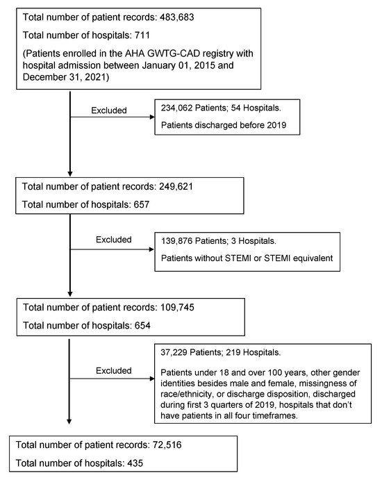 - Osho, A.; Fernandes, M.F.; Poudel, R.; de Lemos, J.; Hong, H.; Zhao, J.; Li, S.; Thomas, K.; Kikuchi, D.S.; Zegre-Hemsey, J.; et al. Race-Based Differences in ST-Segment–Elevation Myocardial Infarction Process Metrics and Mortality From 2015 Through 2021: An Analysis of 178 062 Patients from the American Heart Association Get with the Guidelines–Coronary Artery Disease Registry. Circulation 2023, 148, 229–240. [Google Scholar] [CrossRef] [PubMed]