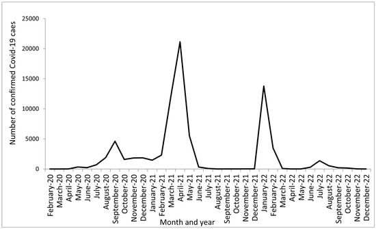 During 2020, 2021 and 2022, a total of 537,320 COVID-19 samples were tested, with an overall positivity of 14.12%. A total of 98,060, 313,918, and 125,342 samples were tested in 2020, 2021, and 2022, respectively, with individual positivity rates of 13,035 (13.29%), 42,909 (13.7%), and 19,936 (15.91%). The numbers of tests increased by 220.12% in 2021 and by 27.82% in 2022 compared to 2020. The epidemiological curve (Figure 1) shows the RT-PCR-confirmed COVID-19 cases during the study period.