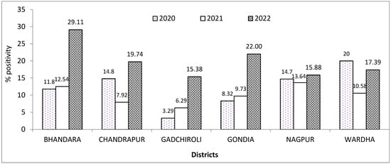 The highest individual positivity in 2020 found to be in the Wardha district, whereas the lowest was found in the Gadchiroli district. In 2021, the highest was found in Nagpur, and lowest was found in the Gadchiroli district. In 2022, the highest positivity was found in the Bhandara district, and the Gadchiroli district was the lowest (Figure 2).