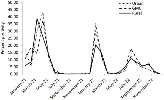 The positivity of SARS-CoV-2 in urban, rural, and GMCH locations in the period May 2021 to December 2022 is shown in Figure 3. In 2021 the percentage peaked in the month of April for GMCH (37.4%) and urban (43.4%), and in March for rural (38.6%). In 2022, two peaks were noticed; positivity peaks were seen during the months of January, i.e., urban (30.19%), rural (35.30%), GMCH (20.37%), and July, i.e., urban (17.65%), rural (12.59%), and GMCH (10.87%).